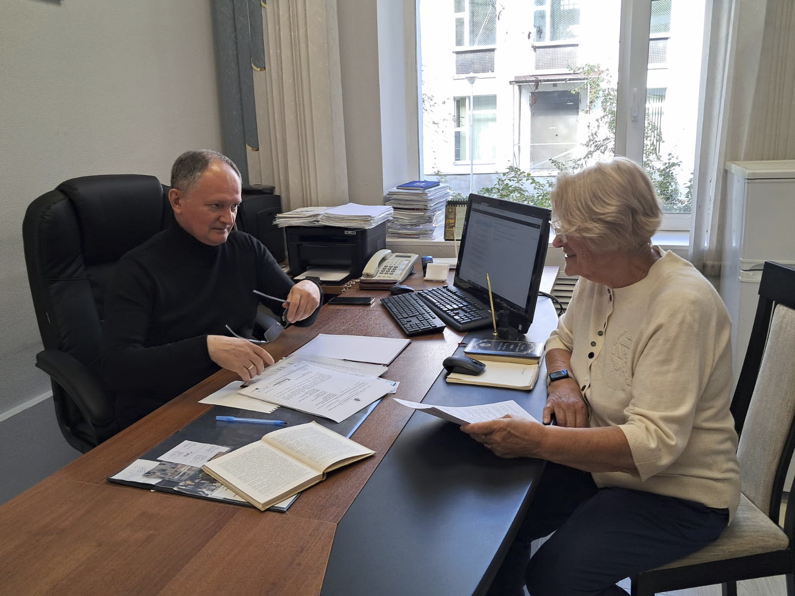 В преддверии Дня пожилого человека директор школы 825 Ю.Г.Шелухин встретился с председателем совета ветеранов школы Н.И.Кукленко.